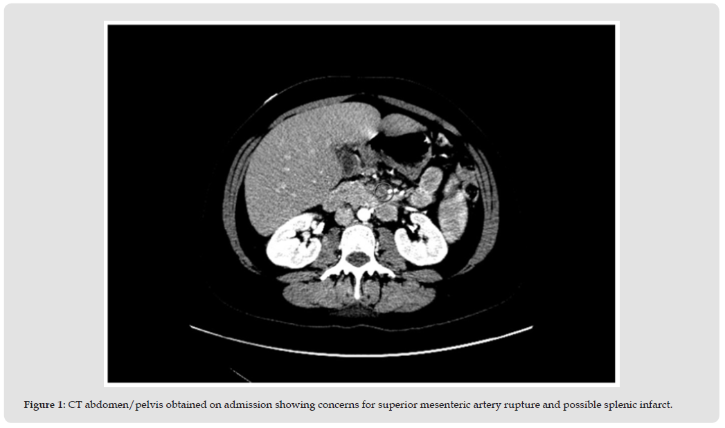 Our patient is a 37-year-old female with a known history of bicuspid aortic valve stenosis and ascending aortic aneurysm for which she underwent aortic valve replacement (AVR) and arch repair with 23 mm Medtronic Mosaic bioprosthetic valve and Gelweave graft. She presented to our institution with a three-month history of progressively worsening exertional shortness of breath and acute onset abdominal pain. CT imaging was concerning for superior mesenteric artery rupture and splenic infarct; (Figure 1) however, her abdominal discomfort was short-lived and conservative management was pursued. Given progressively worsening dyspnea on exertion, a transthoracic echocardiogram (TTE) was obtained. This revealed the presence of a vegetation on the aortic valve bioprosthesis in addition to moderate to severe aortic regurgitation; TTE images were also suggestive of aortic root abscess. (Figure 2). Admission electrocardiogram showed normal sinus rhythm in the setting of first-degree AV block and chronic left bundle branch block. (Figure 3) Blood cultures were obtained, and the patient was started on broad spectrum antibiotics including vancomycin and cefepime. Interestingly, the patient had been afebrile and hemodynamically stable throughout the admission. On admission, the patient had an elevated white blood cell count of 11,600 and a C-reactive protein of 12.6. Physical examination revealed a holosystolic murmur rated at 4/6 and a diastolic murmur at the left sternal border rated at 4/6. The patient did not exhibit any additional findings related to IE including Osler nodes or Janeway lesions.