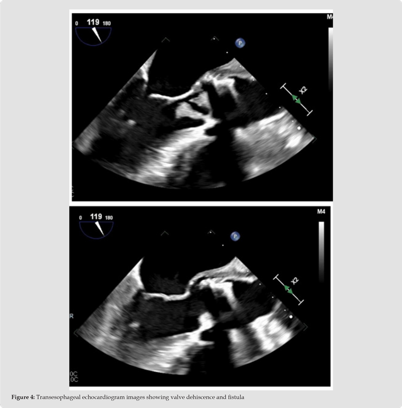 Subsequently, the patient underwent transesophageal echocardiography (TEE) which showed a large mobile echogenicity attached to the aortic valve bio-prosthesis, dehiscence along the aortic-mitral continuity and a thickened periaortic region. (Figure 4) Despite negative blood cultures up until that point, the findings were thought to be consistent with highly complicated endocarditis of the bioprosthetic aortic valve with fistula and periaortic abscess. TEE also showed moderate mitral and tricuspid regurgitation; there was no evidence of endocarditis involving the mitral, tricuspid or pulmonic valves. On day five of growth, both blood cultures grew C.hominis and hence a diagnosis of endocarditis complicated with paravalvular abscess was made. The patient was referred to quaternary center where she underwent redo-sternotomy with aortic valve and root replacement with a 24 mm aortic homograft, in addition to mitral and tricuspid valve repair. She received epicardial right atrial and right ventricular leads with generator placement without any significant complications [7]. As expected, surgical pathology of the valvular vegetation was consistent with bacterial endocarditis. The patient continued to do well in the immediate post-operative period and was successfully discharged home in stable condition.