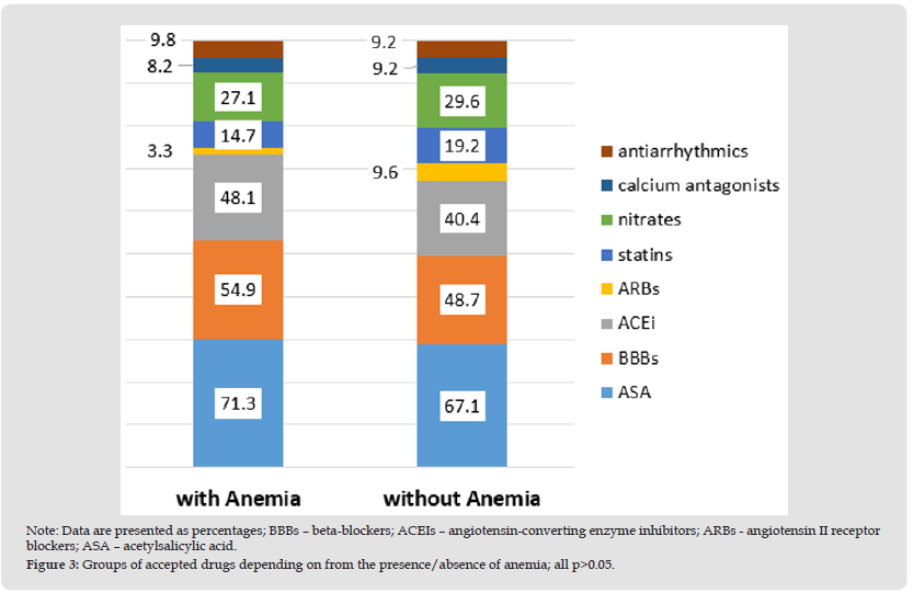 Anemia: Measurement of blood hemoglobin (Hb) levels was carried out in 362 subjects, of which 122 (33.7%) had anemia of varying severity (1 gr. - main); in 240 (66.3%) the blood Hb level was within the normative values (2 gr. – control).The average blood Hb level is 1 g. = 101.01±13.03 g/l and in 2 g. – 122.21±8.51 g/l (p<0.0001). In 1 g. presence of anemia - 1 degree. occurred in 106 (86.9% of 122 people with anemia); anemia - 2 degrees – 10 (8.2%) and anemia - 3 degrees. – in 6 (4.9%) patients. Reference blood Hb values in each of the selected subgroups were 105.14±4.43 g/l; 84.80±6.73 g/l and 55.00±13.65 g/l, respectively. A comparative analysis of anamnestic data on the drug groups taken, depending on the presence or absence of anemia, is presented in Figure 3. As is clearly presented in Figure 3, there were no significant differences in the nature of drug therapy in the analyzed groups (all p>0.05). However, it should be noted that ACS-patients with anemia took relatively more drugs containing ASA (the difference was 4.2%); BBBs (difference = 6.2%) and ACEIs (difference 7.7%). However, the average amount of medications taken per day in both groups was comparable: 1g. – 2.34±1.50 units. and in 2 g. – 2.33±1.68 units. (p>0.05). That is, patients with ACS and concomitant anemia turned out to be more adherent to taking the main groups of cardiovascular drugs (ASA, beta blockers and ACE inhibitors), although the quantitative level of compliance did not differ from that of the control group.