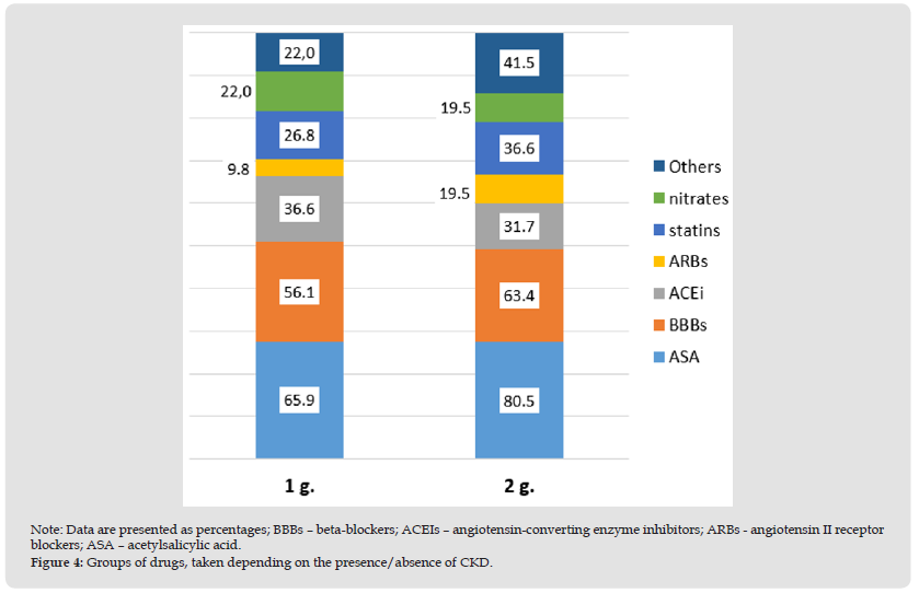 Chronic Kidney Disease: The CKD-EPI formula was used to determine the presence and stage of chronic kidney disease (CKD). In total, GFR calculations were performed in 82 patients (whose tests included creatinine determination). Of these, 4 people had a GFR level ≥ 90 ml/min/1.73 m2, which corresponded to CKD stage 1 (normal); in 37 patients the GFR level was 89-60 ml/min/1.73 m2 (CKD stage 2); in 30 patients, GFR = 59-30 ml/min/1.73 m2 (CKD – stage 3); in 7 respondents GFR = 29-15 ml/min/1.73 m2 (CKD stage 4) and in 3 patients GFR < 15 ml/min/1.73 m2 (CKD stage 5). As is known, stages 3-5 of CKD, in which GFR decreases <60 ml/min/1.73 m2, correspond to the definition of “chronic renal failure” (CRF).To conduct a comparative analysis, patients were divided into 2 groups: 1 g. – 41 patients with relatively preserved renal function (GFR level ≥ 60 ml/min/1.73 m2, i.e. patients with CKD stages 1-2) and 2 g. – 41 patients with impaired renal function (GFR level <60 ml/min/1.73 m2, i.e. patients with CKD stages 3-5). A comparative analysis of anamnestic data on the drug groups taken among the subjects showed (Figure 4) that drugs ASA-containing by 14.6%; BBBs – by 7.1%; ARBs – by 9.7%; statins – by 9.8% – were more often taken by patients 2 g. On the contrary, the intake of ACE inhibitors and nitrates was 4.9% and 2.5% less frequent than in the comparison group (all p>0.05). The average number of medications taken per day in 1 g. amounted to 2.39±1.84 units and in 2 g. – 2.93±1.66 units. (p>0.05). That is, patients with ACS in combination with renal dysfunction were characterized by an increased level of compliance with drug therapy, but the identified trends did not reach the level of significance (all p>0.05).Thus, this fragment of the study established that the presence of any concomitant pathology contributed to an increase in the level of compliance in patients with ACS.