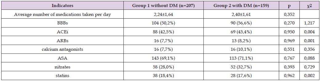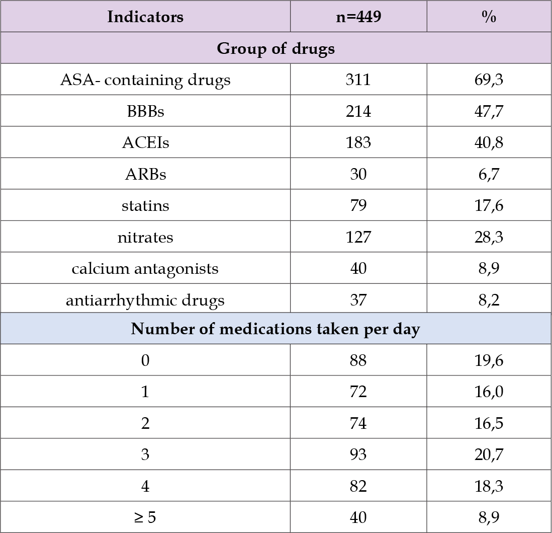 During the study, the level of compliance or adherence of patients to treatment was assessed based on the analysis of anamnestic data on the groups of medications taken, described in the medical records. In this aspect, the following groups of drugs were analyzed: