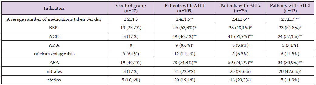 Note: n – number of patients; AH – arterial hypertension of 1-3 degrees; BBBs – beta-blockers; ACEIs – angiotensin-converting enzyme inhibitors; ARBs - angiotensin II receptor blockers; ASA – acetylsalicylic acid; * - significance of differences in comparison with the control group at p < 0.05; ** - significance of differences compared to the control group at p<0.001.