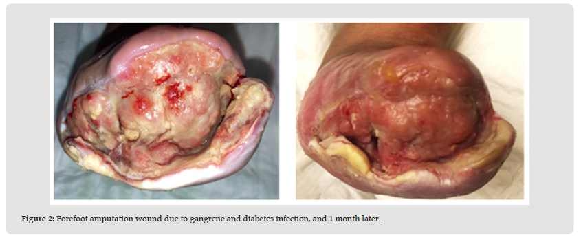 • Case-2: Our second patient is a 68-year-old man with diabetes and significant aortic stenosis requiring surgery. A right common femoral artery occlusion was confirmed in the background of the 5th finger gangrene of the right leg. Femoral thrombendarteriectomy and 5th toe amputation was performed. Two months later due to severe diabetic peripheral vascular stenosis and soft tissue infection, forefoot amputation was required. After that, despite two months of physical vascular therapy (BEMER®) and the use of smart dressings, stagnation of the wound was seen. When the patient started to use Abilar® cream, there was significant discharge, but the plaque was easily removable, which was not the case before. At the same time, within one month, granulation started to occur in the critical, resected area of the 1st metatarsus, which had previously not shown granulation, and the wound was fused into one level wound. Unfortunately, the arch of the foot collapsed due to osteomyelitis. In the late presenting patient, we had to perform crural level amputation due to sepsis, despite of it the patient died (Figure 2)