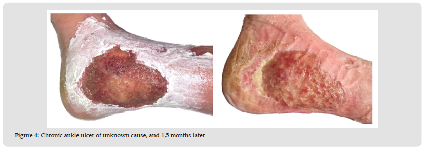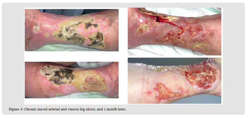 • Case-3: The 68-year-old woman has a history of varicose veins and severe coronary artery disease. Risk factors are smoking and obesity. She presented with non-healing leg ulcers of mixed venous and arterial origin for almost a year ago. After percutaneous coronary intervention, bilateral venous crossectomy, right femoral artery and popliteal 2nd segment thrombendarterectomy and femoro-popliteal bypass surgery were performed. The leg wound was rapidly drying up, covered with black necrosis, which, with the use of Abilar®, was detachable within one month, the necrosis and plaque were increasingly dissolving, and granulation was starting. Treatment of the wound is still ongoing (Figure 3).