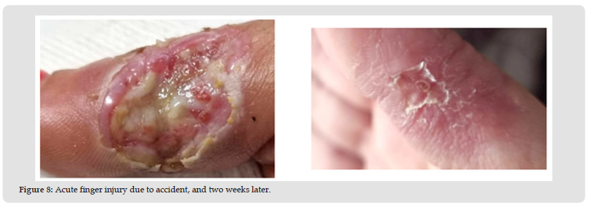 • Case-8: The 33-year-old female patient has no internal medical conditions. Her finger was injured by a hand tool. After the wound was treated, the skin along the sutures was necrotic and detached, leaving a necrotic wound bed one millimetre deep. Following the application of Abilar®, the wound continuously cleared up, intense granulation started and completely exfoliated within two weeks (Figure 8).