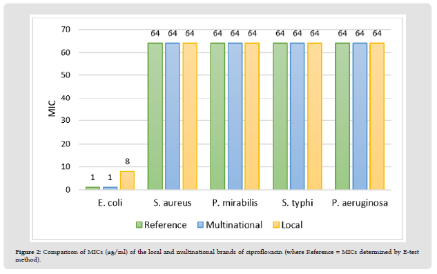 Results: The MICs (µg/ml) of ceftriaxone and ciprofloxacin determined via E-test method in isolates of aureus (16; 64), P. mirabilis (>64; >64), S. typhi (>64; 64) and P. aeruginosa (>64; >64) were in the resistant range. In E. coli, ceftriaxone was sensitive (1) while ciprofloxacin was resistant (1). Regarding brand comparison, the multinational brand of ceftriaxone was found to be sensitive against E. coli (1) as compared to the local brand (64) and S. aureus, though resistant with both brands, showed relatively lesser MICs with the multinational brand as compared to the local brand (16; >64). Although ciprofloxacin was resistant in all isolates, MICs of the multinational brand were relatively lesser as compared to the local brand in E. coli (1; 8) and S. typhi (64; >64). MICs of the multinational brands of ceftriaxone and ciprofloxacin in all clinical isolates were in 100% agreement with MICs determined via E-test method.