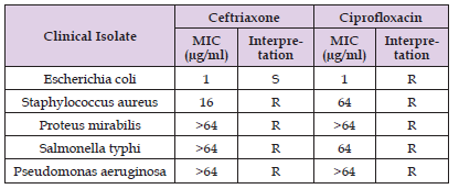 Clinical isolates of E. coli, S. aureus, P. mirabilis, S. typhi and P. aeruginosa were revived through inoculation on 5% sheep blood agar (SBA), which was incubated in 5% CO2 for 24 hours. Once, strains were revived, the bacterial colonies were inoculated in phosphate-buffered saline (PBS) to obtain a turbidity index of 0.5 MacFarland. After the bacterial suspensions were prepared, Agar Dilution method was performed to assess the MIC for each of the strains. The protocol mentioned in the CLSI guidelines was followed for performing Agar Dilution method. According to the procedure, ceftriaxone and ciprofloxacin were dissolved in dimethyl sulfoxide. In order to produce continuous two-fold dilutions, antibiotics ceftriaxone and ciprofloxacin were added to the Mueller-Hinton agar (MHA) medium, in concentrations ranging from 0.0015 to 16 ug/ml for ceftriaxone and from 0.002 to 2 ug/mL for ciprofloxacin. The adjusted inoculum of each of the bacterial suspensions was then delivered to the surface of the agar plates containing varying concentrations of the antibiotics, through inoculating loops.