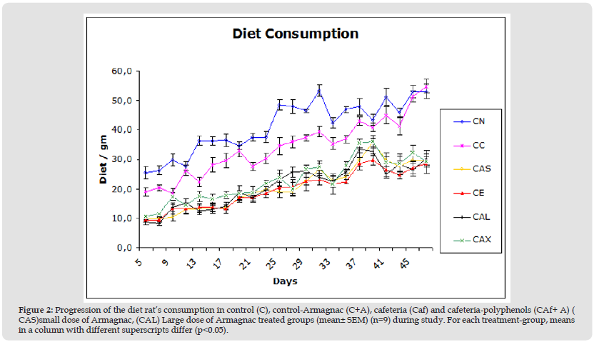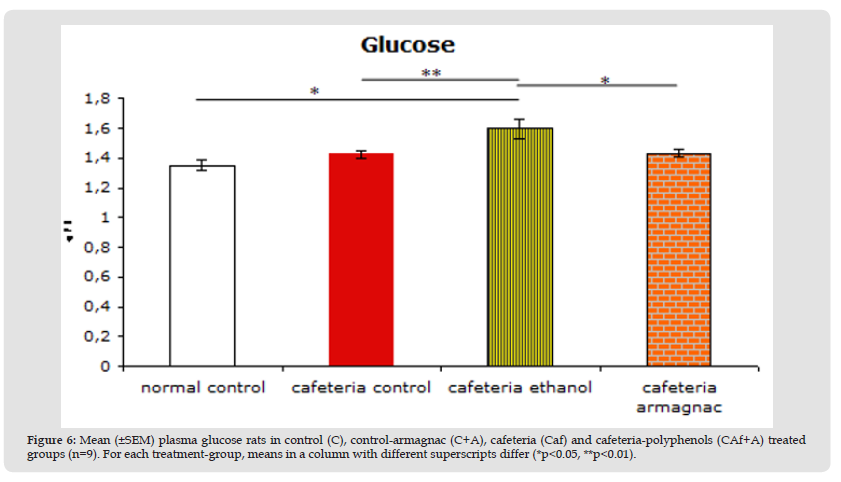 They possess a lot of other biological activities, such as anti-inflammatory, anti-cholesterol-emic, Vaso-active or anti-carcinogenic effects. Yet their mechanism of action remains uncertain. There are no studies concerning the effect of Armagnac and polyphenolic compounds obesity and dyslipidaemia. The aim of our present study was therefore to evaluate the ability of a chronic oral administration of Armagnac extract to correct metabolic disorders induced by a cafeteria diet in the rat, and consequently to understand better their mechanism of action. Effects on classics biochemical parameters were determined. The main findings of the present study are that Armagnac treatment restores lipids abnormalities (triglycerides, phospholipids), leptin, and glucose level in cafeteria treated rats. Moreover cafeteria-fed rats have developed an leptin-resistance: leptin levels haven’t influenced food intake. In obese patients leptin-resistance is associated with insulin-resistance and lipidic disorders. Armagnac treated cafeteria rats had a significant reduction in overweight and leptinaemia compared to controls rats.