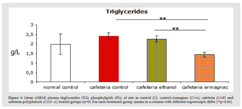 Concerning the metabolic parameters overweight was associated with dyslipidaemia, triglycerides and phospholipids underwent a significantly increase. Armagnac administration decreased these augmentations. These findings contrast with Zhan et al. studies [11,21] on tea polyphenols who didn’t observe any differences in total cholesterol and triglycerides concentrations. Armagnac treated cafeteria rats had a significant reduction in overweight, glycemia and leptinaemia compared to controls rats. Moreover cafeteria-fed rats have developed an leptino-resistance: leptin levels haven’t influenced food intake. In obese patients leptino-resistance is associated with insulino-resistance and lipidic disorders [22-26].
