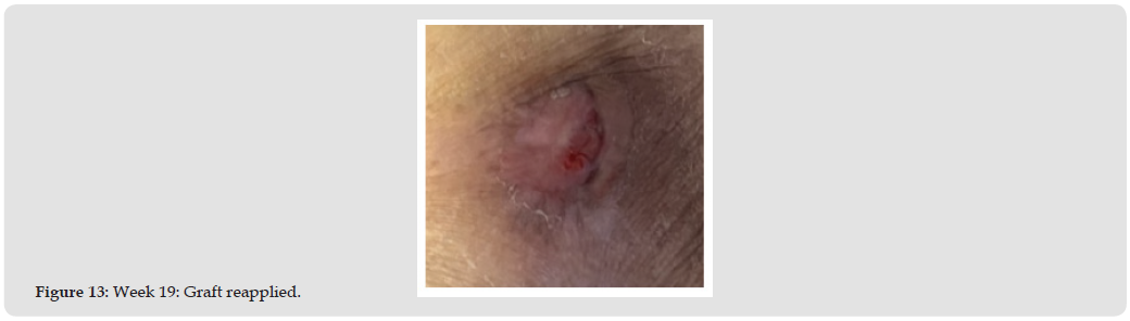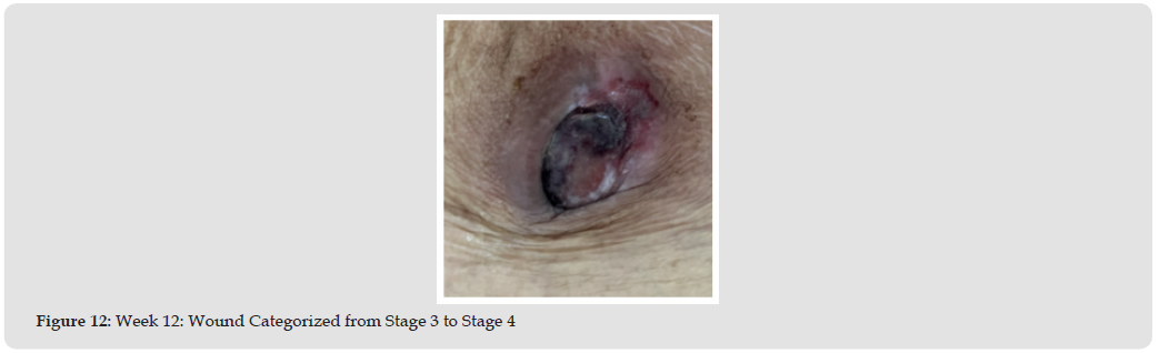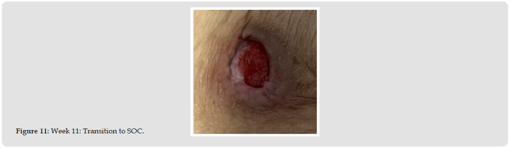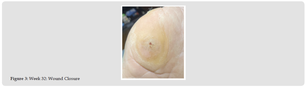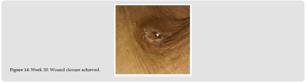 Throughout treatment, the wound exhibited fluctuations in size and depth, experiencing periods of both improvement and regression. Two weeks after the end of graft therapy, the pressure ulcer worsened from Stage 3 to Stage 4, manifested by increased wound size and undermining. The approach to therapy alternated between grafts and diligent Standard of Care (SOC) based on the wound’s condition. Graft therapy was reintroduced on Week 19, leading to full closure of the hard-to-heal wound by the following week.