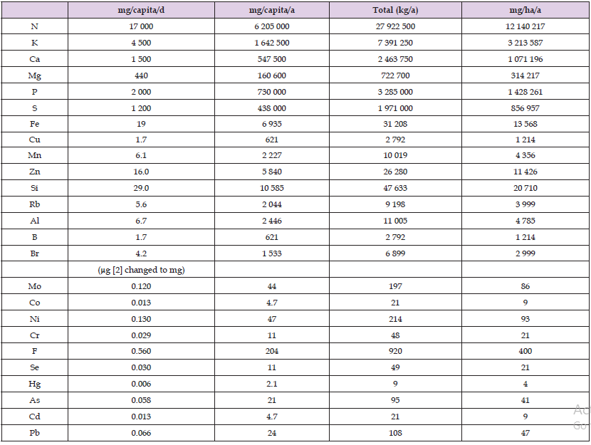 The mean cultivated agricultural area, used for calculations, was ca 2.3 million ha (2.4 in 1950 and 2.2 million ha in 2020 [4]). In Table 1 are represented the fertilizing potential of AADS’s by each element in agricultural soils by daily amounts (mg/capita/d) and annual amounts (mg/capita/a and Total (kg/a)) and annual amounts per hectare (mg/ha/a) (Table 1). The mineral element content of the agricultural products has decreased during the last century. In a study based on data from the 1930’s and 1980’s the average contents showed a general decreasing trend, but not by P [5]. The (geometric mean of) Mg and Cu decreased significantly in vegetables as well as in fruits - by Cu contents in vegetables ca 80 %.
