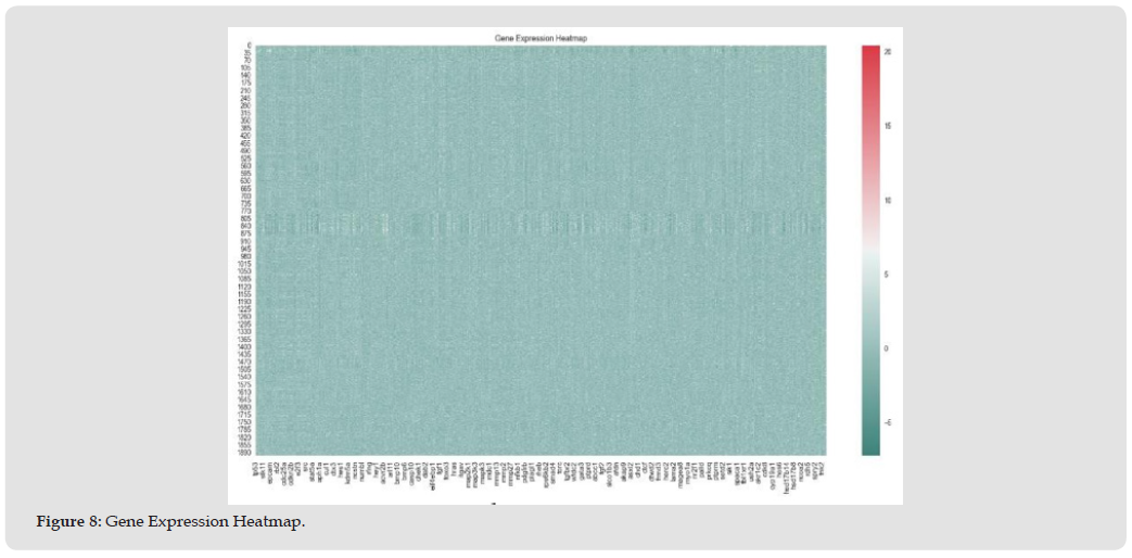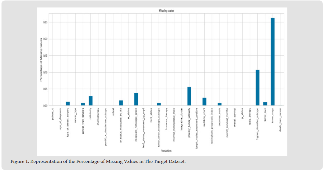 Data Processing and Visualization: As the dataset is high dimension dataset that contains gene expression data of 1980 breast cancer patients. Preprocessing involves cleaning the data, handling missing values and standardizing the features, essentially removing the irrelevant and redundant information that may affect the performance of the model. The standardization of features is done to ensure that all the features are on the same scale to prevent bias towards any feature. Figure 1 represents the percentage of null/missing values by the formula.