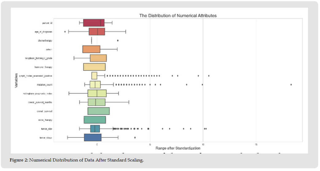 Figure 2 represents the target data after standard scaling by a box plot which provides a clear picture of distribution of numerical attributes after standardization, From the above graph we found that some variables have outliers such as chemotherapy, lymph nodes examined as positive, mutation count, tumor stage and tumor size.