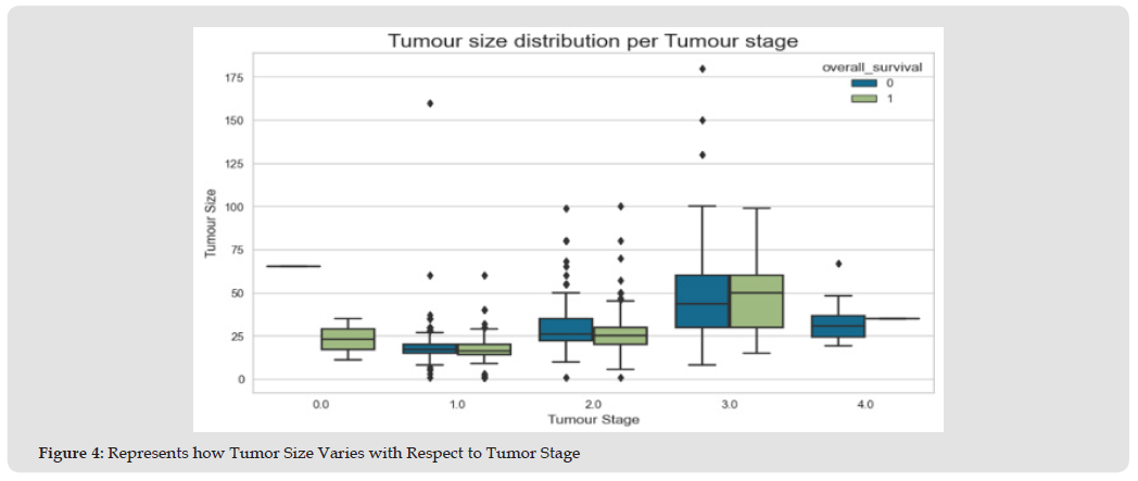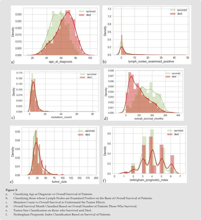 Feature Selection: Now once we scaled the dataset, we performed clinical data analysis to gain more understanding of the data and to classify them. Hence, we visualized various features like age at diagnosis, lymph node examined as positive, mutation count, overall survival month, tumor size and Nottingham prognostic index vs overall survival labelling “green” color as those who survived and “red” color as those who died. Figures 3a-3f will provide a clear idea about the same by visualizing it. We found out that patients who survived have bimodal distribution and those who died have left skewed distribution. For patients whose lymph nodes were examined as positive, we found that both the patients who survived and died have right skewed distribution, hence this feature does not contain dependency as a feature. Patients who survived as well as died have right skewed distribution. We concluded from the graph that patients who survived have bimodal distribution and those who died have right skewed distribution. From the above graph we concluded that patients who survived and died have right skewed distribution. From the above graph, we can observe that both the patients have multimodal distribution. We found out some more interesting conclusions by analysis that the difference between the attributes that is survival time and age at diagnosis, patients who were older and when diagnosed with breast cancer were more likely to not survive. Also, duration from the time of the intervention to death or to current time is longer in the patients who survive. That means that patients are either dying early from breast cancer or surviving. And while analyzing about the patients those who lived, died because of breast cancer and those who died due to other diseases with respect to the age of diagnosis we found that patients who survived from breast cancer are more likely to survive longer compared to patients who died because of breast cancer and person who died because of other diseases. Patients with breast cancer are more likely to die faster than a person who died because of other diseases (Figure 4). In addition to our analyzation, we did analysis of tumor size distribution with respected to tumor stage. We found out that: