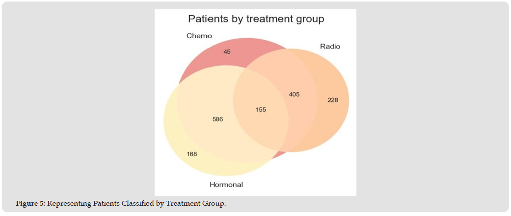Also, we found out that the distribution of number of positive lymph nodes for died patients is wider than survived patients. Thus, to gain more understanding for classification from data visualization we performed analyzation of the distribution of treatment and survival of patients we concluded as a result that patients who had undergone chemotherapy treatment, the difference between died class and survived class is larger for patient with chemotherapy compared to patients without chemotherapy. Died class patients without Chemotherapy were large in number, more than 800. Patients who had undergone through Hormonal therapy the difference between died class and survived class is quite large for patient with hormonal therapy compared to patients without hormonal therapy. At last, the patients who had undergone Radio therapy the difference between the two classes is quite high and the number of patients died in this therapy is highest as compared to others. This can be represented more clearly with a Venn diagram (Figure 5).