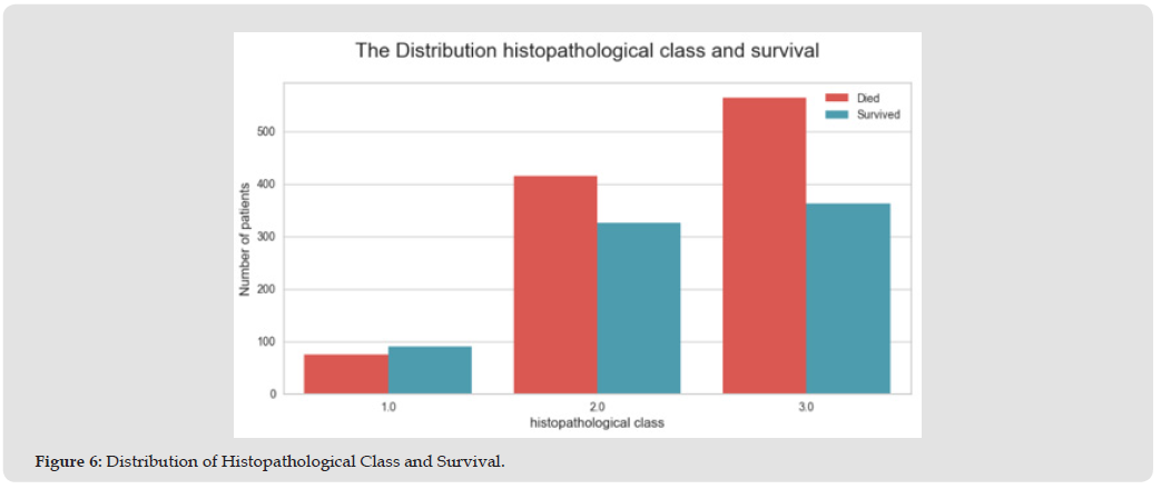 From the above graph we concluded most of the patients get combination of chemotherapy and hormonal therapy treatment followed by radio therapy and chemotherapy. Radio therapy is the most often given treatment to the patients in terms of sole treatment, and no patients are given combination of radio therapy and hormonal therapy. We also analyzed distribution of histopathological class and survival as a feature of classification (Figure 6). From the above diagram we found out that the patient in died class is always higher than in survived class except for class 1.0. The difference of number of patients both died and survived class for class 1.0 is high compared to other class. In addition to all these analyzations, understanding the correlation between the attributes is also very important process for feature selection and understanding the dependency of attributes. The figure below will provide a representation of the correlation (Figure 7).