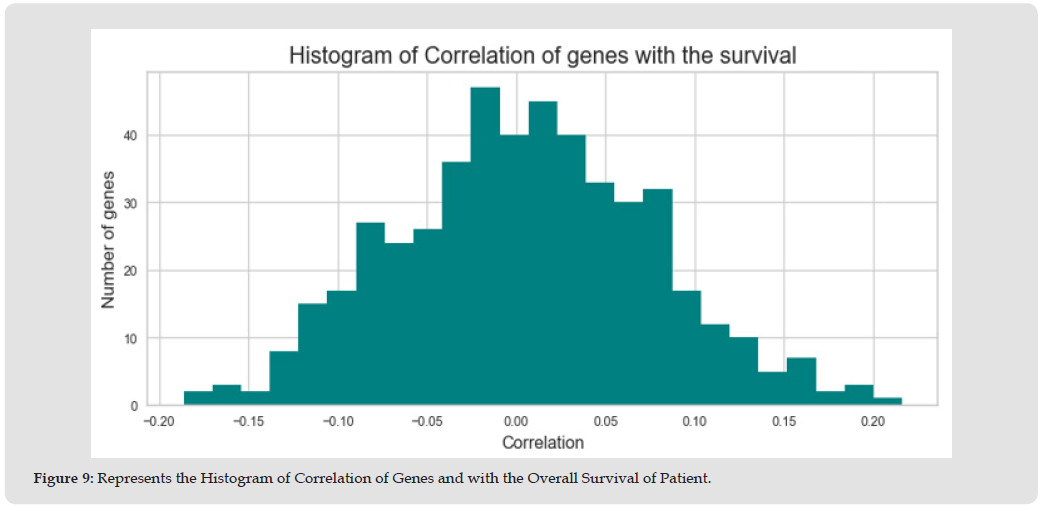 It is clearly found that there are some attributes which have positive and negative correlations with other attributes. Besides if we observe correlation between attributes and overall survival, we found that all the variables which have negative correlation with overall survival is weakly correlated (Table 1). In comparison with baseline number of patients who had no treatment was 289 and proportion of survival with no treatment was 0.381 and the baseline proportion of survival in all groups was 0.421. In conclusion the proportion of survival with no treatment is quite close to the baseline proportion of survival in all group. Characteristics of the patients in the data, the mean age of diagnosis was almost 61 and the most occurring tumor stage was 2 and most occurring histopathological type is 3 and mean of tumor is 26mm with survival probability of 0.42 that is less than 50%. Apart from this clinical attribute distribution we processed the data to find maximum and std in each column by z- score to understand the genetic distribution and to plot the heatmap we found the maximum value possible in genetic data is 18.6351 and minimum value possible in genetic data was -6.4387. with number of outliers in top 10 genetic features. The diagram below represents the Gene Expression heatmap (Figure 8). Using this heatmap we reached to a conclusion that all of the genetic attributes have relatively the same distribution shape for two classes which we discussed previously that is dead and survived. Also, we derived the correlation of genes with the overall survival using standard deviation as a measure. The graph below will provide a clear representation of the correlation (Figure 9).