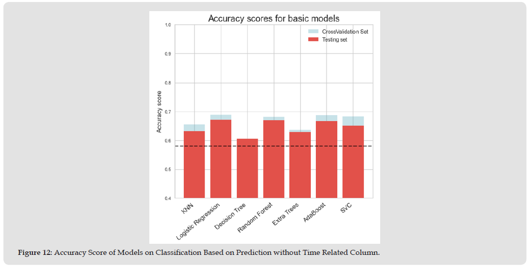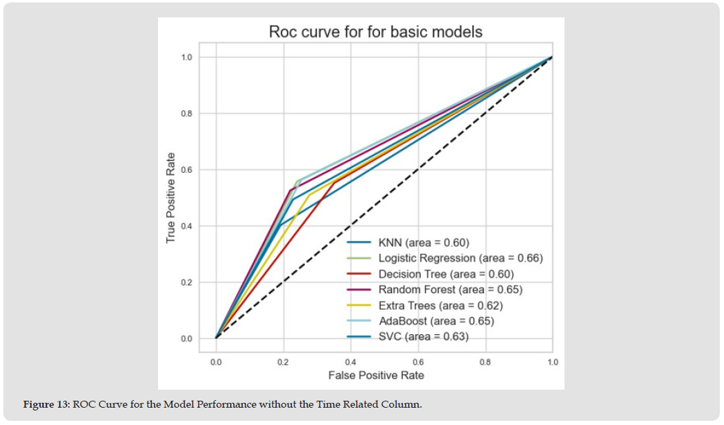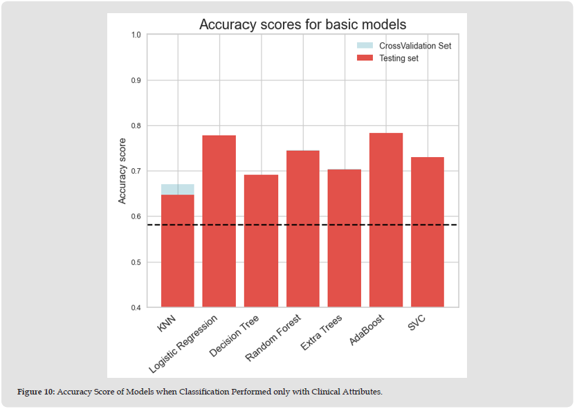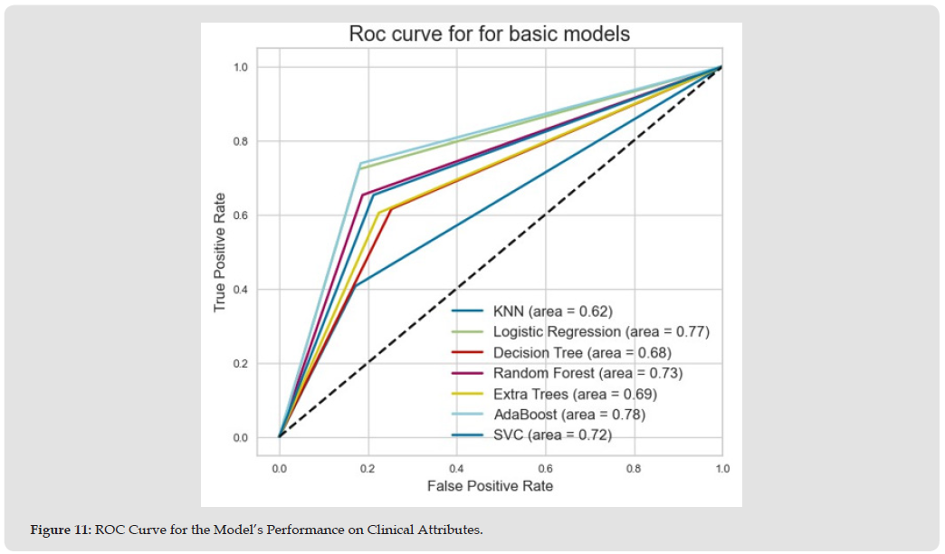 Classification Only with Clinical Attributes: We found that logistic regression model performed the best with accuracy of 0.777 and AUC of 0.777 and KNN having the lowest accuracy of 0.64 and AUC of 0.62. The below graph will represent a clear picture of model performance (Figures 10 & 11). Also, after applying Grid Search with Random Forest Classifier and Extra Trees. We achieved model accuracy of 0.738442 for Random Forest and an accuracy of 0.726363 Extra Tree Classifier Model.