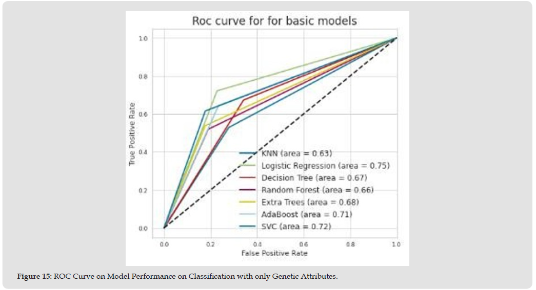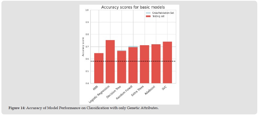 Classification with Only Genetic Attributes: With this parameters model performed more better, Logistic regression performed best with accuracy of 0.75 and KNN remains at lowest with an accuracy of 0.63 (Figures 14 & 15). After applying grid search on Random Forest Algorithm and Extra Tree Algorithm the accuracy obtained for both the algorithms was coincidently the same that is 0.6781.