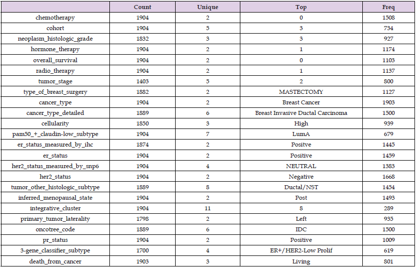 [‘patient_id’, ‘age_at_diagnosis’, ‘type_of_breast_surgery’, ‘cancer_ type’, ‘cancer_type_detailed’, ‘cellularity’, ‘chemotherapy’, ‘pam50_+_claudin-low_subtype’, ‘cohort’, ‘er_status_measured_by_ ihc’, ………………... ‘mtap_mut’, ‘ppp2cb_mut’, ‘smarcd1_mut’, ‘nras_mut’, ‘ndfip1_mut’, ‘hras_mut’, ‘prps2_mut’, ‘smarcb1_mut’, ‘stmn2_mut’, ‘siah1_mut’]