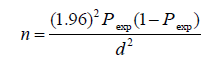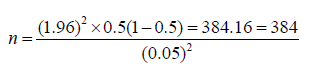 Where: n = required sample size; Pexp = expected prevalence; and d = desired absolute precision. The sample size was calculated based on 50% expected prevalence and with 5% absolute precision. So the calculated sample size was: