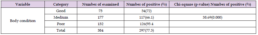 Our 384 sheep examined coprologically for gastrointestinal parasite eggs 297(77.3%) where found positive. There was no statistically significant difference in prevalence of gastrointestinal parasites between sexes (p<0.05). Body condition was found to be a risk factor for GIT parasites prevalence where the poor body condition sheep had higher prevalence of the parasites 126(95.4) whereas the lowest prevalence was recorded in medium (66.1) body condition score with a statistically significant difference (P>0.05) (Table 1).