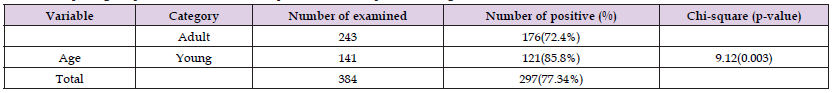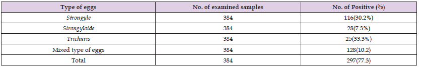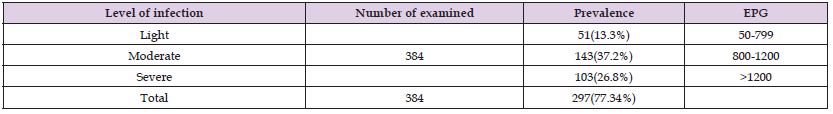 The gastrointestinal nematodes of sheep are one of the major important parasitic diseases that reduced the productivity of sheep raised by farmers using traditional management system in and around Abayi Chomen District. The coprological examination done for this study using different techniques revealed an overall gastro-intestinal helminthes infestation with prevalence of 77.3% (n=384) The coprological examination performed for this study revealed the existence of nematodiasis in small ruminants with an overall prevalence. This finding is lower than the results of other surveys in small ruminants in Western Regassa, et al. [8-12]), Southern Ethiopia. The decrease in the GIT nematodiasis prevalence in the present study compared with the other studies in the country could be due to the existence of unfavorable climatic or environmental factors that could support prolonged survival and development of infective larval stage of most nematodes Amenu[13] and Rossainga [14] Different coprological examination done revealed that sheep were affected by strongyle species, Trichuris species, Strongyloides species.this finding is in harmonious with reports of previous studies conducted in Ethiopia by Fikru, et al. [15], Hailelul [12] and Tefera, et al. [16]. Among the different parasites identified from the faeces of sheep, the prevalence of strongyle species counted for (39.06 %), Trichuris species (8.42%), Strongyloides species (9.43%) and mixed types are (43.10%). In this study, the strongyle species were identified in general terms, since there eggs were not differentiated easily to genus level Van Wyk, et al. (2004).