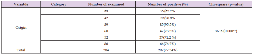 All the sheep examined coprologically in six kebeles, samples from Jare showed slightly higher parasitic infestation (85 %) as compared to other sites. The difference between study kebeles was found to be statistically significant (p>0.05) (Table 2).