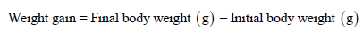 Weight Gain: Body weight gain was calculated in grams by using following formula: