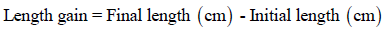 Length Gain (cm): During the whole trial, fish were collected for the measuring fish length. Length gain was calculated in (cm) unit as following: