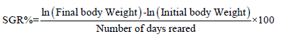 Specific Growth Rate (SGR): It was determined per week. After every week, the final weight was subtracted from the initial weight and the data obtained this way was divided by number of the days (seven days) and then multiplied by 100 (Figures 3 & 4).