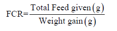 Feed Conversion Ratio (FCR): Feed conversion ratio was determined per week. The formula for the calculation of FCR is given below: