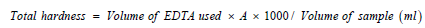 Total Hardness: The total hardness of Ca2+ and Mg2+ ions in natural water, represented as CaCo3 is referred to as total hardness. A 50ml sample of water was placed in an Erlenmeyer’s flask and pH was kept between 12 and 13 by adding the proper amount of buffer solution. Eriochrome Black T (EBT) indicator was added to the reaction mixture mixed and titrated against Ethylene Diamine Tetra Acetic Acid (EDTA) (0.01N) to reach the end point, which was blue in color. The following formula was used to determine the overall hardness: