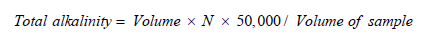 Total Alkalinity: The overall concentration of carbonates or bicarbonates in water bodies is known as total alkalinity. The water body also contains silicates, hydroxides, phosphates and ammonia among other bases. Bicarbonates are present when the pH of water is below 4.5 and the color of the water changes to yellow. To calculate the total alkalinity of water the following approach was employed. To prevent denaturation, a water sample was collected and immediately analyzed in a polythene bag. In Erlenmeyer’s flask, 20ml of water were obtained and 0.1ml of methyl orange were added to the water. The reaction mixture was stirred and it was then titrated against 0.1N of sulfuric acid to reach the end point which was faintly orange color. Total alkalinity was measured by the following formula: