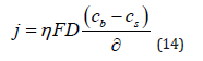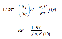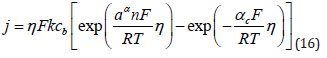 2) Equation (16) is valid only if the reaction occurs under purely activation control. When a single metal is being deposited, mass-transport limitation can be taken into account by replacing the bulk concentrations in Eq. (17) with the surface concentration. At steady state this is rather simple, since