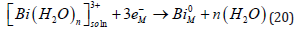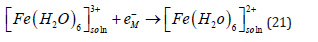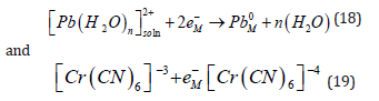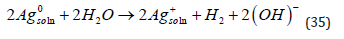 Although metal deposition is often represented in simplified form as shown in Eq. (1), this representation has some profound internal contradiction (apart from the trivial correction of including explicitly water as the ligand, as shown in Eq. (2)). It is well known that metals do not consist of neutral atoms. They consist of positively charged metal ions “immersed” in a sea of delocalized electrons. The net result is a neutral piece of metal, of course, but the point is that at least one electron of each atom is delocalized, and constitutes the conduction band of the metal. Taking this into account, Eq. (1) should be rewritten (ignoring the water molecules for simplicity) as