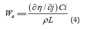 The choice of the characteristic length L is not always obvious. It may be the length of the electrode being plated, the distance between the working and the counter electrodes or “the dimension of the irregularity” - for example, the difference between the shortest and the longest distance between the two electrodes. The last is the best choice in most cases, since it reflects the differences in the solution resistance in different areas of the piece being plated. The exact value taken is not critical, however, since Wa should be used only as a guideline, and the actual current distribution (or variation of thickness of plating) can be found either experimentally or by obtaining a numerical solution for the specific geometry and the kinetic parameters of the metal deposition considered. The partial derivative, taken at constant concentration (and, of course, constant temperature and pressure), is the differential Faradaic resistance, RF, in units of Ω cm². The solution resistance, expressed in the same units, can be written as: