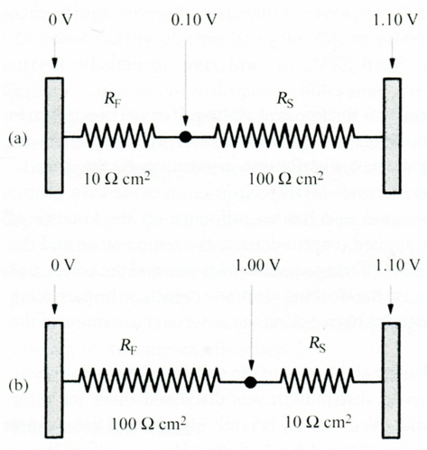 Thus, for the case shown in Figure 2a the potential drop over RF is only 0.10 V, while that over Rs is 1.0 V. This represents primary current distribution. Since Rs depends on the cell geometry, this will lead to nonuniformity of current distribution. In contrast, (Figure 2b) represents secondary current distribution. Most of the potential drop will occur across the Faradaic resistance, and changes in the cell geometry have little effect on the total resistance between the anode and the cathode, leading to nearly uniform film thickness. The Wagner number is a dimensionless parameter that helps us determine the probable level of uniformity of current distribution in electroplating. There are two limiting cases to be discussed: