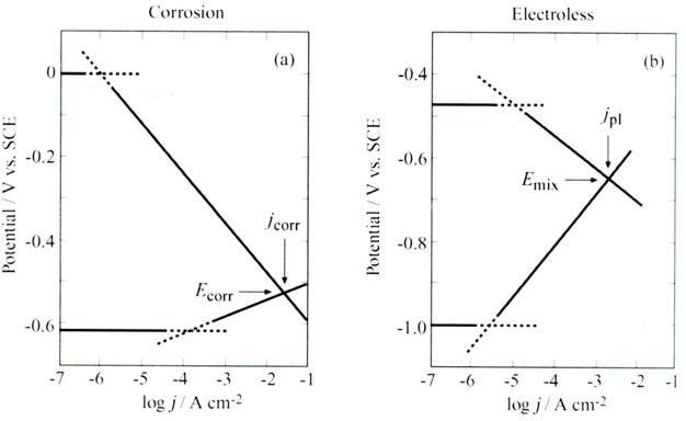 The same logic applies to electroless plating, except that the roles are reversed. Here, the rate of anodic oxidation of a suitable reducing agent must be equal to the rate of cathodic reduction of metal ions. The two cases are shown side by side in Figure 7 , where Figure 7a is just a reproduction of an Evans diagram [63], and Figure 7b shows the case of electroless plating of copper, employing formaldehyde as the reducing agent [64]. For the electroless deposition process corresponding to Figure 6b, the pH is set at 12.5 by adding NaOH, and EDTA is added as a complexing agent, to prevent precipitation of Cu(OH)2. As in the case of corrosion, the mixed potential represents steady state with two reactions involved, it is not an equilibrium state. The Tafel slopes for the anodic and cathodic reaction are not in any way related to each other and the relationship αan + αc = n does not apply, (although it may happen to be numerically correct). Indeed, even the number of electrons transferred may not be the same for the two reactions. The only constraint determining the position of Emix is that the total anodic current must be equal to the total cathodic current. Micro- polarization at potentials close to the mixed potential can be used to determine the current density during electroless plating, following the formalism used in electrode kinetics and replacing jcorr by jpl.