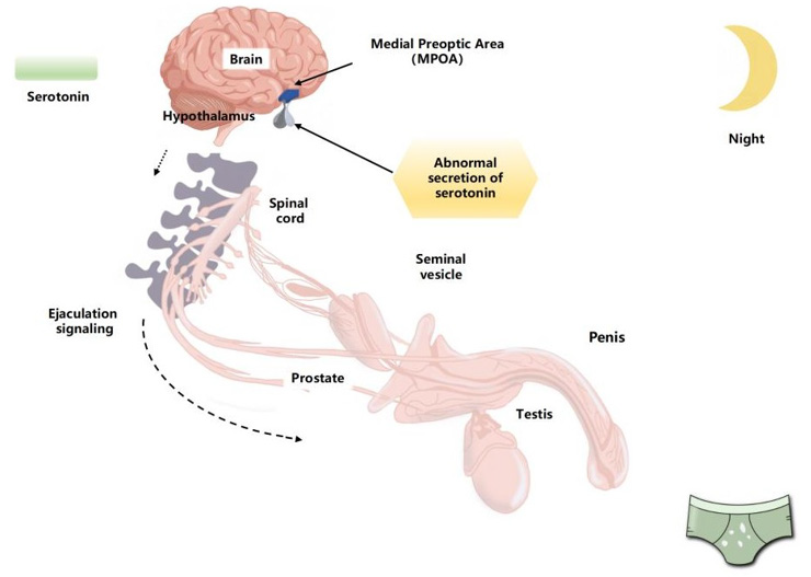 However, in cases where serotonin secretion is aberrant, it can activate the medial preoptic area (MPOA) in the brain, which subsequently transmits ejaculation signals to the spinal ejaculation center, culminating in semen ejaculation [17]. Wakefulness and sleep constitute a cyclic physiological process intricately orchestrated by the interplay of diverse neurons and neurotransmitters within the brain, maintaining the stability of this vital cycle [15]. The author postulates that, during the regulation of sleep-wake patterns, an abnormal accumulation of 5-HT secretion, potentially influenced by several underlying factors such as congenital predisposition, early-life excessive masturbation, anxiety, and fluctuations in physical temperature, may eventually precipitate spermatorrhea. Should patients fail to adopt adequate measures to mitigate this erroneous secretion, the accumulation of these deviations may, over time, solidify into a recurring pattern, occurring with a fixed frequency. This postulated mechanism may underlie the occurrence of Long-Term Nocturnal Emission (LTNE), as depicted in Figure 1.