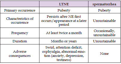 This proposed name offers several advantages. Firstly, it clearly delineates between pathological and physiological occurrences, enhancing diagnostic precision. Secondly, it serves as a concise yet informative label that facilitates communication among healthcare professionals and patients alike. Lastly, by providing a focused and well-defined research target, LTNE establishes a solid foundation for further investigations into the underlying mechanisms, risk factors, and potential treatments for this condition. As the patient population seeking treatment for Long-Term Nocturnal Emission (LTNE) grows, the authors have meticulously summarized its clinical characteristics in comparison to spermatorrhea (Table 1). LTNE is characterized not solely by the frequent occurrence of nocturnal ejaculation but also by a diverse array of symptoms that permeate daily life. These systemic manifestations encompass osphyalgia, profound fatigue, diminished concentration abilities, and emotional disturbances such as anxiety, depression, and irritability, all of which may manifest subsequent to persistent nocturnal ejaculation among LTNE patients. The relentless frequency of nocturnal ejaculation, coupled with the post-ejaculatory discomfort, imposes a significant burden on the daily functioning of adult males afflicted with LTNE. Their lives are adversely impacted, and some individuals even report suicidal ideation stemming from the intolerable emotional and physical distress associated with this condition, as evidenced by patient narratives.