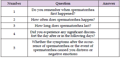 Patients afflicted with Long-Term Nocturnal Emission (LTNE) commonly experience a persistent inability to restrain nocturnal emissions, accompanied by a spectrum of associated syndromes. They grapple with a lack of control over their nocturnal occurrences, often coupled with mild anxiety. To cater to the unique characteristics of these patients, the authors devised a comprehensive questionnaire that encapsulates the essential features of the condition (Table 2). This questionnaire encompasses crucial details such as the initial onset of spermatorrhea, its frequency, the duration of LTNE, the symptoms manifested post-spermatorrhea, and whether these episodes elicit negative emotions. While this questionnaire provides valuable insights into the clinical profile of LTNE, it serves primarily as a reference tool for patients, as further validation through rigorous evidence-based medical research is necessary. Ongoing studies are essential to affirm its efficacy, and the development of a corresponding evaluation system will undoubtedly enhance and streamline its clinical application.