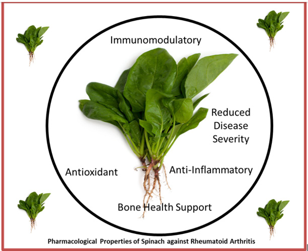 Spinach, scientifically called Spinacia oleracea, is a highly nutritious vegetable abundant in bioactive compounds that exhibit properties such as anti-inflammatory, antioxidant, and Immunomodulatory effects. Although there is limited evidence supporting the use of spinach in treating rheumatoid arthritis, it shows potential in managing symptoms and reducing inflammation. Adding spinach to a balanced diet could complement conventional treatments for RA. However, it is not intended to be a substitute for prescribed medications or other recommended therapies. Patients who have RA should seek advice from their healthcare providers before making important changes to their diet. Including spinach in their overall management plan for the condition should be considered. To gain a better understanding of the precise impact of spinach on RA and to establish precise dietary recommendations for patients, further research, such as well-executed clinical trials, is required. In the end, a customized strategy for managing RA that takes into account traditional therapies and dietary interventions could yield the most favorable results for individuals with this long-lasting autoimmune disease.
