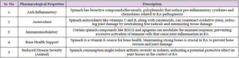 Rheumatoid arthritis is an incapacitating autoimmune disorder that impacts a substantial number of individuals globally. The condition is distinguished by persisting inflammation within the synovial tissue of joints, resulting in the manifestation of pain, swelling, and compromised joint integrity. The prevailing therapeutic modalities for managing rheumatoid arthritis commonly encompass no steroidal anti-inflammatory drugs disease-modifying anti-rheumatic drugs and biologic agents. Although these medications have demonstrated efficacy, they frequently precipitate adverse reactions and may not afford absolute alleviation of symptoms [1]. In recent years, there has been an increasing surge in the curiosity to investigate supplementary and alternative therapeutic approaches in addressing the symptoms related to rheumatoid arthritis (RA), particularly emphasizing dietary interventions [2]. Spinach (Spinacia oleracea), an abundant foliar vegetable endowed with numerous essential nutrients and bioactive constituents, has garnered considerable attention due to its putative anti-inflammatory and antioxidant attributes. This essay endeavors to offer a comprehensive examination of the current body of literature regarding the utilization of spinach in the management and therapy of rheumatoid arthritis [3]. Spinacia oleracea, a widely cultivated plant, holds significant value as a staple in dietary consumption and serves as a prevalent ingredient in the food processing sector on a global scale.
