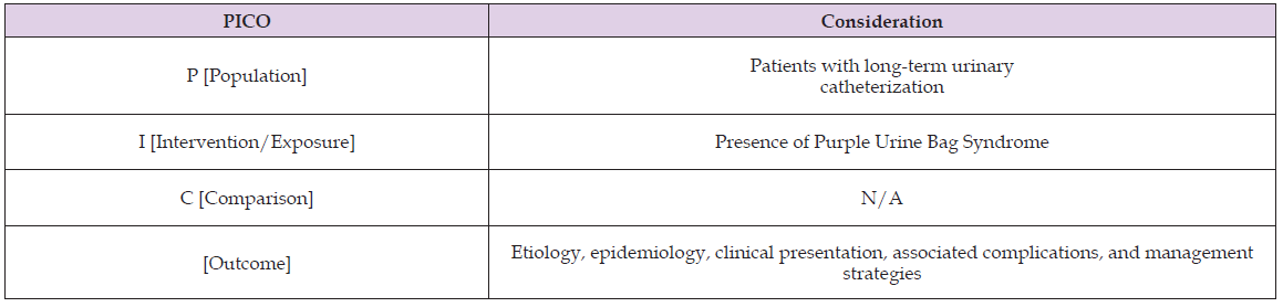 Question: In patients with long-term urinary catheterization, what are the etiology, epidemiology, clinical presentation, associated complications, and effective management strategies of Purple Urine Bag Syndrome compared to those without the condition? The PICO framework is given in the following Table 1.
