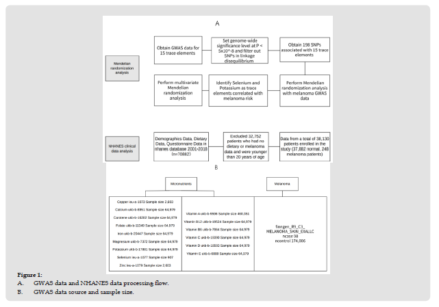 Mendelian randomization (MR) is a prospective causal inference method that utilizes genetic variation as instrumental variables to assess the impact of exposure factors on observed data outcomes. MR can mitigate non-measurement errors or confounding factors and circumvent reverse causality through Mendelian genetic laws [19,20]. GWAS data were used for Mendelian randomization analysis. SNP information was extracted from genome-wide association studies of 15 micronutrients. Due to high statistical efficiency, the primary statistical method used was the inverse variance weighted method. Data were obtained from the IEU Open GWAS, UK Biobank, and Finn databases, and genetic variations for melanoma were acquired. All data used in this study are openly accessible and do not require additional ethical approval. Blood micronutrients served as exposure factors, with melanoma as the outcome factor. Only p-values < 5×10−8 and minor allele frequencies > 1% were considered for selection. Within 1000 kb frames, the linkage disequilibrium (LD) cutoff value was set at R2 < 0.001. Heterogeneity and pleiotropy were also assessed separately. GWAS data for 15 micronutrients were found, including Copper, Zinc, Calcium, Selenium [21], Carotene, Folate, Iron, Magnesium, Potassium, Vitamin A, Vitamin B12, Vitamin B6, Vitamin C, Vitamin D, and Vitamin E, as depicted in the Figure 1B.