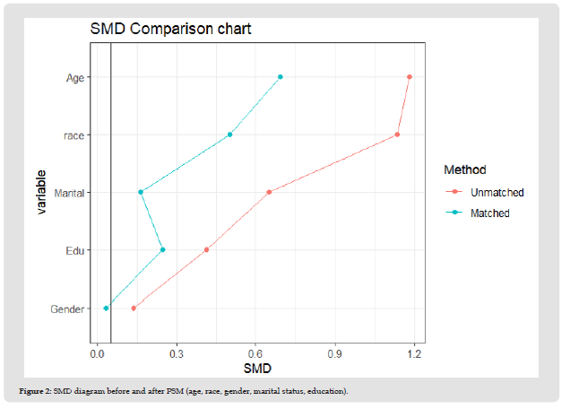 The enrollment process of this study is illustrated in Figure 1. After excluding participants with missing values and those under the age of 20, a total of 38,130 participants were included in the study. Table 1 provides the baseline characteristics of this study. When comparing melanoma patients with non-tumor patients, statistically significant p-values were found for categorical variables such as race (p < 0.001), age (p < 0.001), education level (p < 0.001), marital status (p < 0.001), and gender (p = 0.032). Among participants with melanoma, 48.5% were male and 51.5% were female. In terms of racial composition, Mexican Americans accounted for 17.3%, Other Hispanics for 8.9%, Non-Hispanic whites for 41.8%, NonHispanic blacks for 22.1%, and Other races for 9.9%. Differences were observed in education level and marital status. Specific details are depicted in the Table 1. In order to reduce the impact of confounding factors and eliminate bias in observational studies, we conducted 1:1 propensity score matching (PSM). There were no statistically significant differences in covariates between melanoma patients and matched non-tumor participants. The propensity score matching and characteristics of dietary micronutrient intake after PSM are illustrated in the Figure 2.