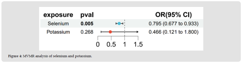 A total of 198 significant SNPs were obtained for 15 micronutrients, and Mendelian randomization analysis was conducted with melanoma GWAS data (finngen_R9_C3_MELANOMA_SKIN_EXALLC). The analysis revealed a correlation between serum selenium and serum potassium and the risk of melanoma, where selenium (IVW, P<0.001, OR: 0.780 (0.694-0.877)) and potassium (IVW, P=0.012, OR: 0.399 (0.194-0.819)) (Figure 3). Based on these results, we concluded that there is a causal relationship between serum selenium, serum potassium, and melanoma in the European population. Cochran's Q and MR-Egger intercept tests confirmed the absence of heterogeneity and horizontal pleiotropy in the MR analysis. Leave-one-out analysis showed that the results remained stable when removing individual SNPs, indicating the reliability of MR estimates. In MVMR analysis, after adjusting for serum potassium, the causal relationship between serum selenium and cutaneous malignant melanoma still existed (p=0.005, OR 0.795 (0.677-0.933)), while after adjusting for serum selenium, the causal relationship between serum potassium and cutaneous malignant melanoma lost statistical significance (Figure 4). All directions and statistical significance of the IVW results in MVMR were consistent with the results of MVMR Lasso regression analysis, and MVMR Egger analysis indicated no directional pleiotropy of the instrumental variables.