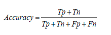 Accuracy=TruePositives+TrueNegatives/TruePositives+TrueNegatives+FalsePositives+FalseNegatives