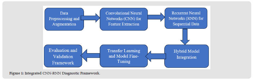 Additionally, adapting techniques from network data analysis and sentiment analysis to medical data will require modifications in preprocessing and feature extraction methods, ensuring their relevance and effectiveness in healthcare diagnostics [15-21]. By integrating these advanced techniques, the proposed architecture aims to enhance overall diagnostic performance, addressing the common drawbacks identified in existing systems and providing a robust framework for future medical diagnostic applications [3,4,6,7]. Figure 1 presents the structure of the Integrated CNN-RNN Diagnostic Framework, which aims to boost the adaptability and efficiency of deep learning models in medical diagnostics. The initial component, Data Preprocessing and Augmentation, is crucial for preparing raw medical data. This process involves cleaning, normalizing, and transforming data into a format suitable for model training. Techniques like rotating, scaling, and flipping images enhance the dataset's diversity, thereby improving the model's ability to generalize across various medical conditions. Ensuring the data is consistent and comprehensive is vital for effective training and reliable diagnostic results [1-2]. The framework then employs Convolutional Neural Networks (CNN) for Feature Extraction, focusing on spatial data analysis essential for interpreting medical images such as X-rays and MRIs. CNNs use layers of convolutions, pooling, and activation functions to identify diagnostic patterns and features, making them highly effective in detecting anomalies in medical imaging [3-4].
